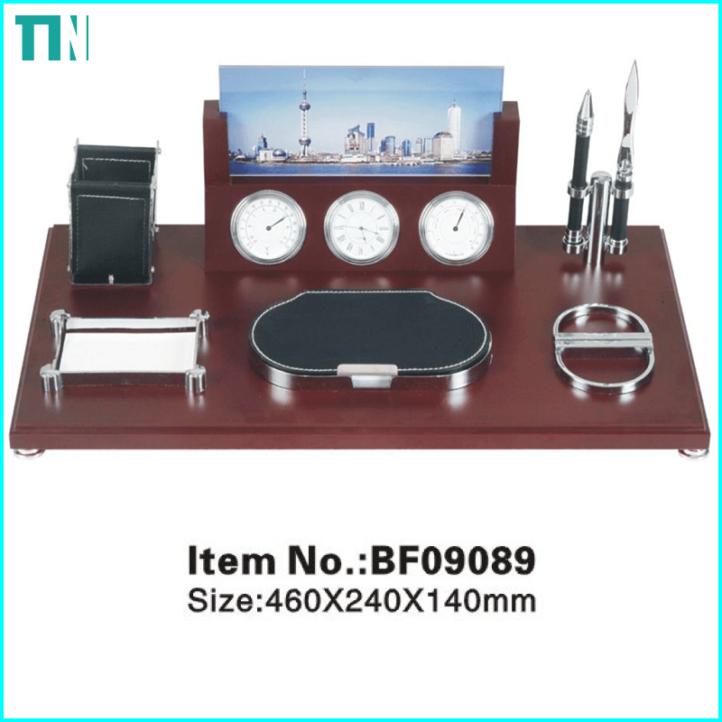 Với chất liệu gỗ mỹ nghệ và PU cao cấp, các nghệ nhân đã chế tác ra những bộ sản phẩm vô cùng sang trọng. Đặc biệt, trên sản phẩm thường có đính kèm những chi tiết như đồng hồ, lịch, ống cắm bút hoặc note ghi chú đem lại sự tiện lợi cho người sử dụng. Ngoài ra, nó còn được trang bị thêm hộp đựng name card giúp bạn lưu trữ danh thiếp của khách hàng và đối tác.