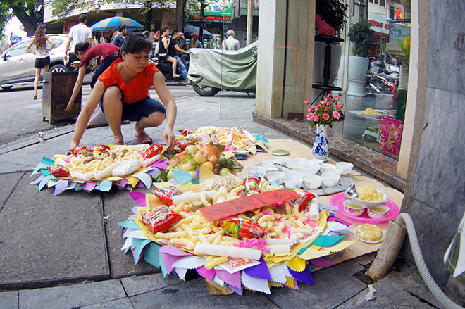 | Người dân bày cỗ cúng rằm tháng 7 trên đường phố Hà Nội. |
