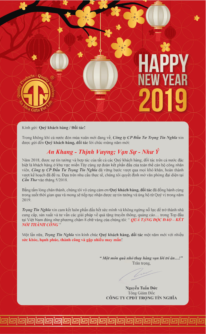 Nhân dịp năm mới Xuân Kỷ Hợi 2019 đang tới gần, Trọng Tín Nghĩa xin được gửi lời chúc năm mới tốt đẹp nhất và thành công nhất đến tất cả các Quý khách hàng và đối tác của TTN!
