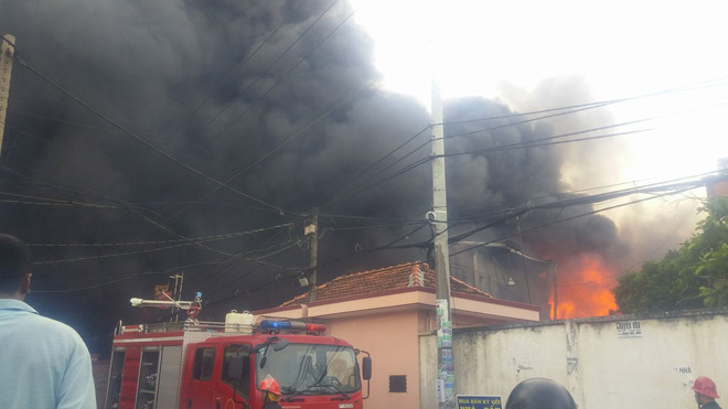 Chỉ trong tích tắc, lửa lan nhanh bao trùm nhà xưởng kèm theo cột khói đen bốc cao cả trăm mét. Đứng xa khu vực cháy 5km vẫn có thể nhìn thấy cột khói đen ngòm.